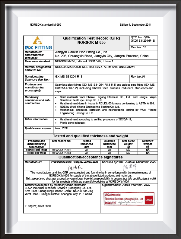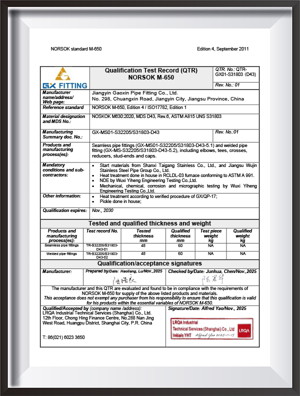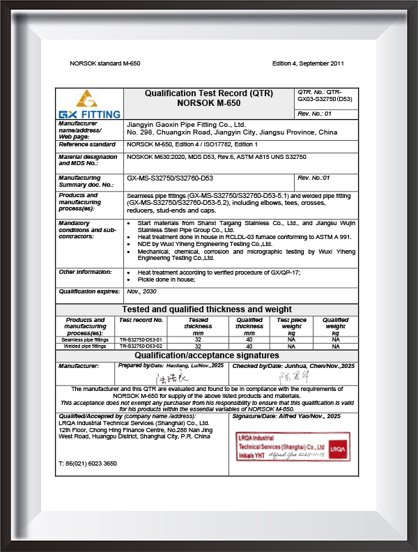 | Certificato | PED, AD2000, EAC, ABS, BV, DNV, NORSOK M650, ISO9001, ISO14001, ISO45001, ecc. |